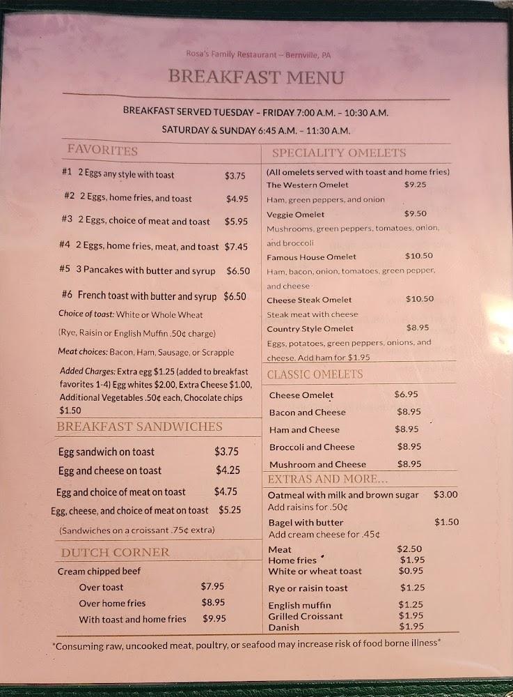 Welcome to Rosa's Family Restaurants, a cozy dining spot located at 7156 Bernville Rd, Bernville, PA. Perfect for families and groups, we offer a delightful range of local specialties for breakfast, lunch, and dinner, all at affordable prices. Enjoy our inviting atmosphere, designed for relaxation and conversation, with features like wheelchair accessibility and ample parking. We proudly serve delicious coffee, healthy options, and shareable plates, along with kid-friendly menus. Whether you're dining in or grabbing takeout, Rosa's is your go-to place for a satisfying meal in a friendly setting. Reservations are welcome, making every visit special!